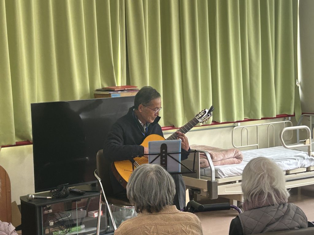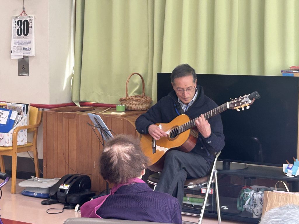 ♬クラシックギター🎸ミニ演奏会♬ 今日はデイサービスで、槌田施設長のクラシックギター生演奏会♬ 曲目も洋楽からおなじみの歌等様々で、苑内は深みのある心地よい音色に包まれました♪ なかなかお目にかかれないギター演奏ということもあって皆さんうっとり聴いておられました(^^♪